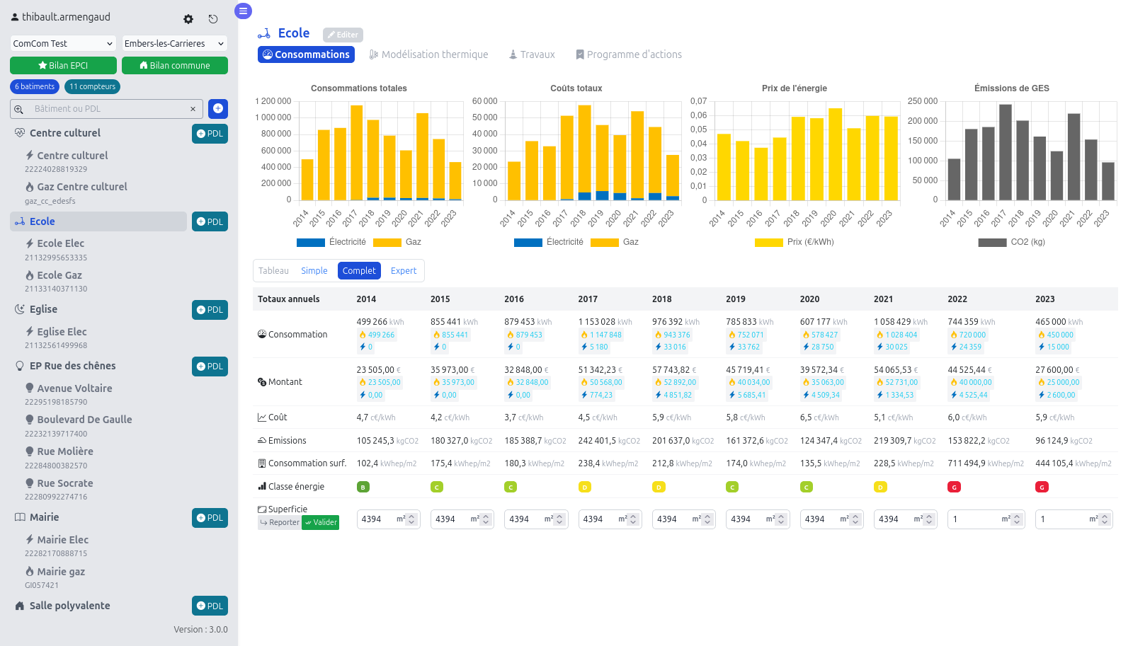 Ajoutez les bâtiments et compteurs d'énergie de votre collectivité, puis importez simplement les données de consommation issues de vos fournisseurs d'énergie. Vous aurez ainsi une vision globale, par année, par bâtiment et par compteur, de vos consommations en énergie kWh et en coûts €